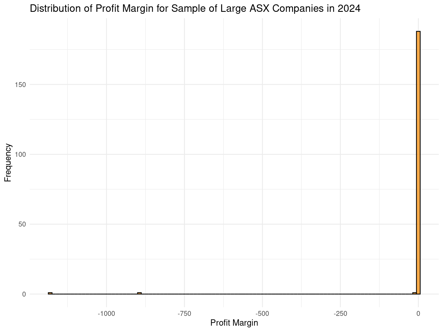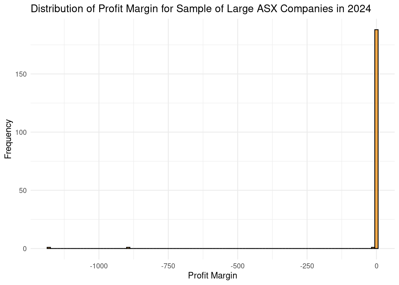 theme_minimal() (c). Hmm! Explain whether you think the plot above effectively visualizes the distribution of profit margin for large Australian public companies. Do we still have extreme observations in our left tail? How do these affect what we can learn about the majority of firms, which exhibit profit margins >= 0?