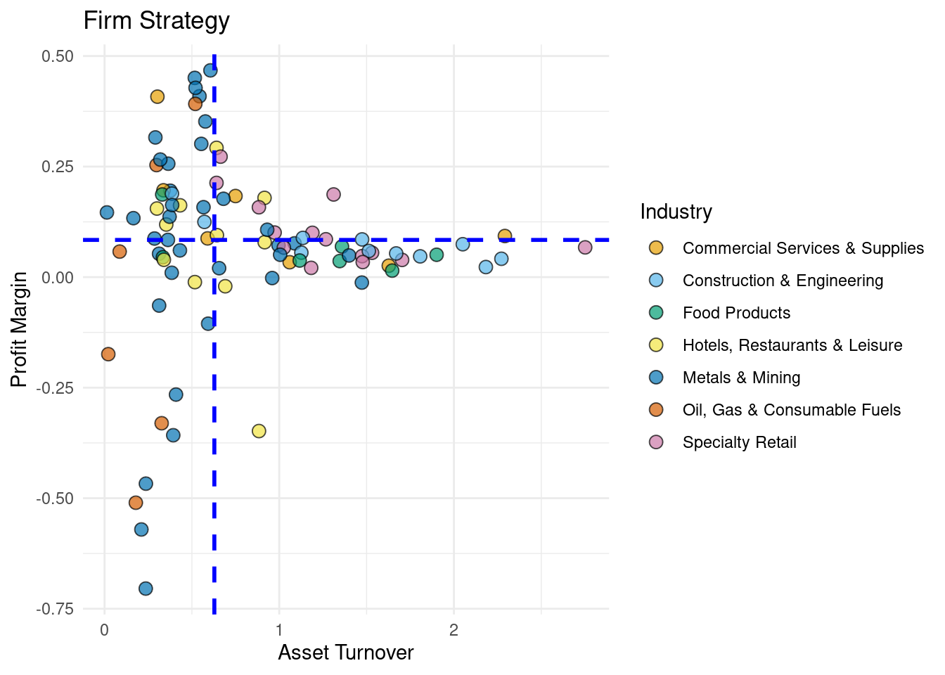 - Explore relationships between firm strategy variables – Create scatterplots to examine how profit margin and asset turnover interact, and classify firms into strategy types (e.g., high margin, high volume, superstar, sinking ship).